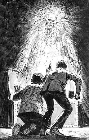 Giunge a casa Darnley il senor Santora, che si professa essere l'ultimo discendente di Chiavo e ne vuole entrare in possesso raccontando alla signora e ai ragazzi la maledizione che grava sullo specchio. Poco dopo dallo Specchio appare il fanstasma di Chiavo mettendo in agitazione la padrone di casa e i Tre Investigatori che però riescono a capirne il mistero.